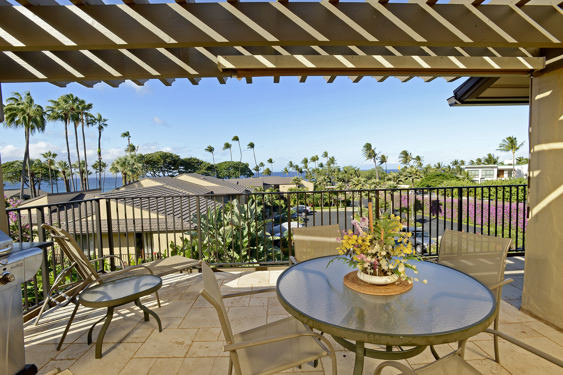 This is a Top Floor condominium with big ocean views from the lanai and living room. Situated in Wailea Elua Village, 24 acres of lush tropical landscapes, luxury accommodations and breath-taking ocean views in a low-rise village atmosphere are featured.